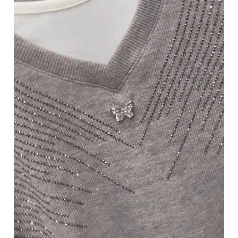 燙鑽撞色假兩件氣質收腰顯瘦V領T恤
