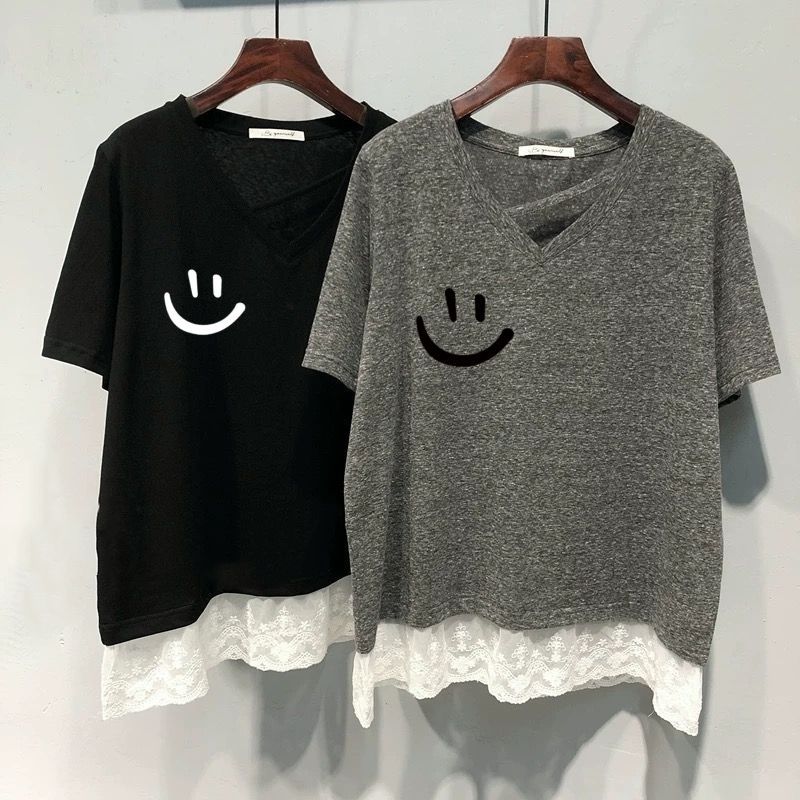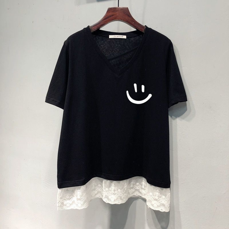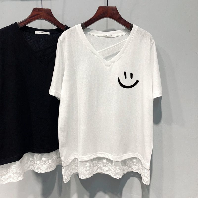氣質顯瘦假兩件蕾絲花邊V領短袖T恤