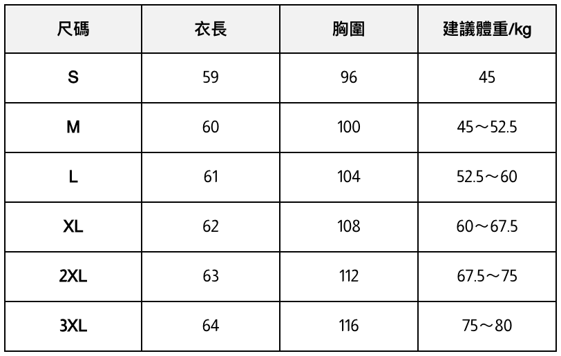 此處給出的參考尺寸表只是一個標準指南