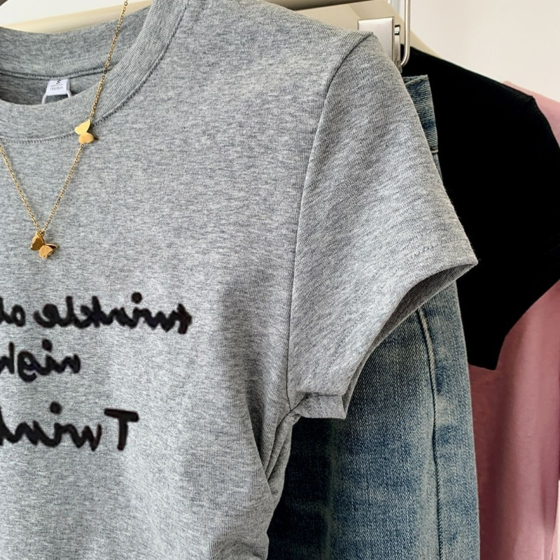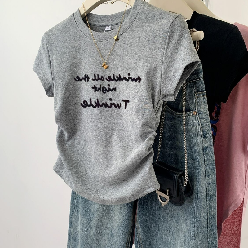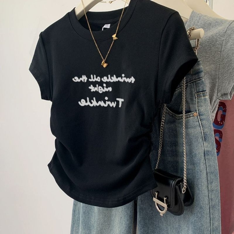 正肩字母印花小眾褶皺收腰短款修身短袖T恤