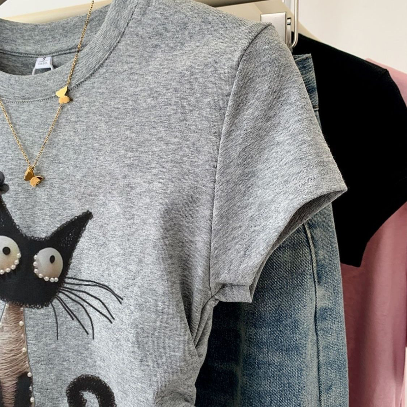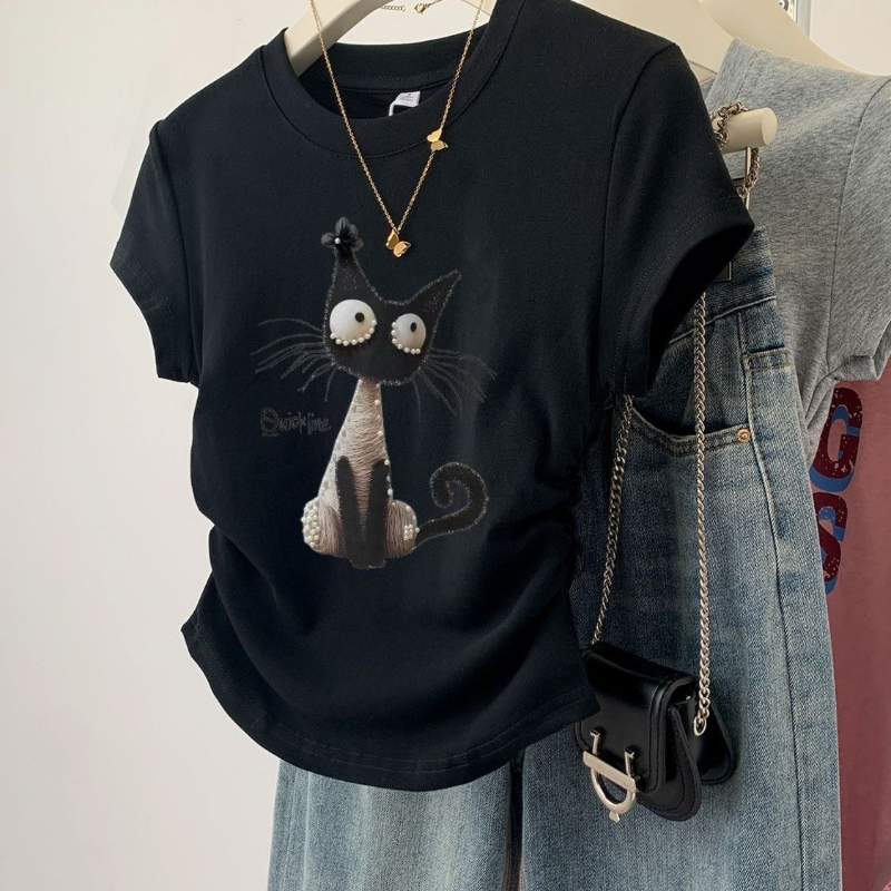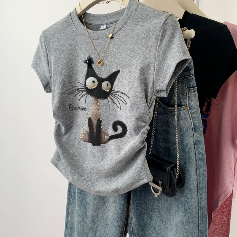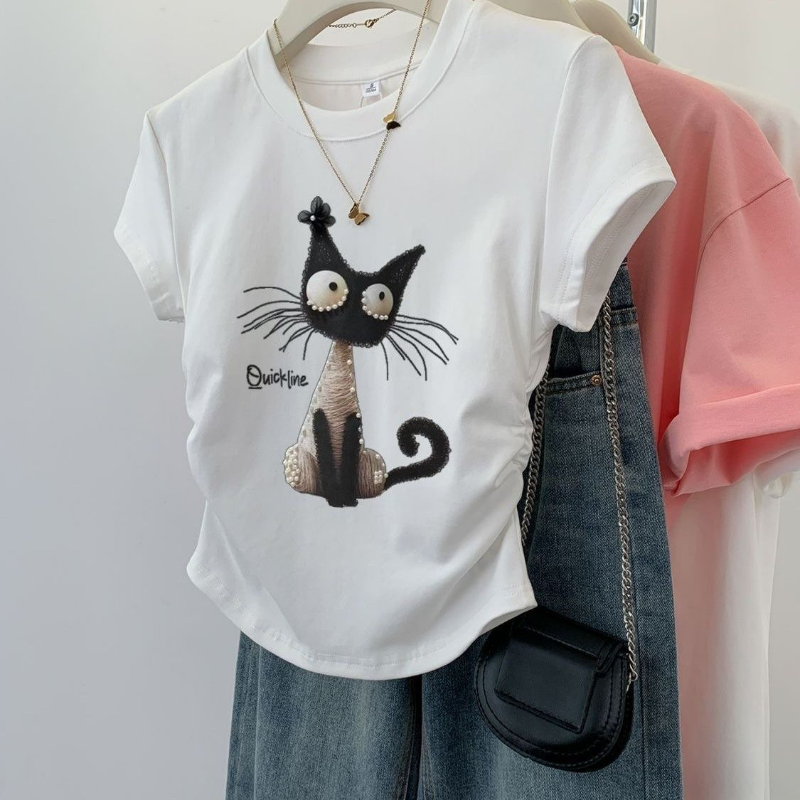 貓咪短款褶皺設計收腰修身正肩短袖t恤