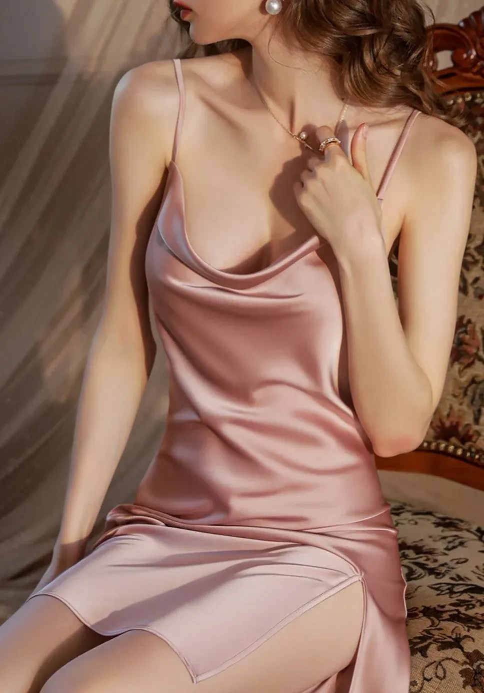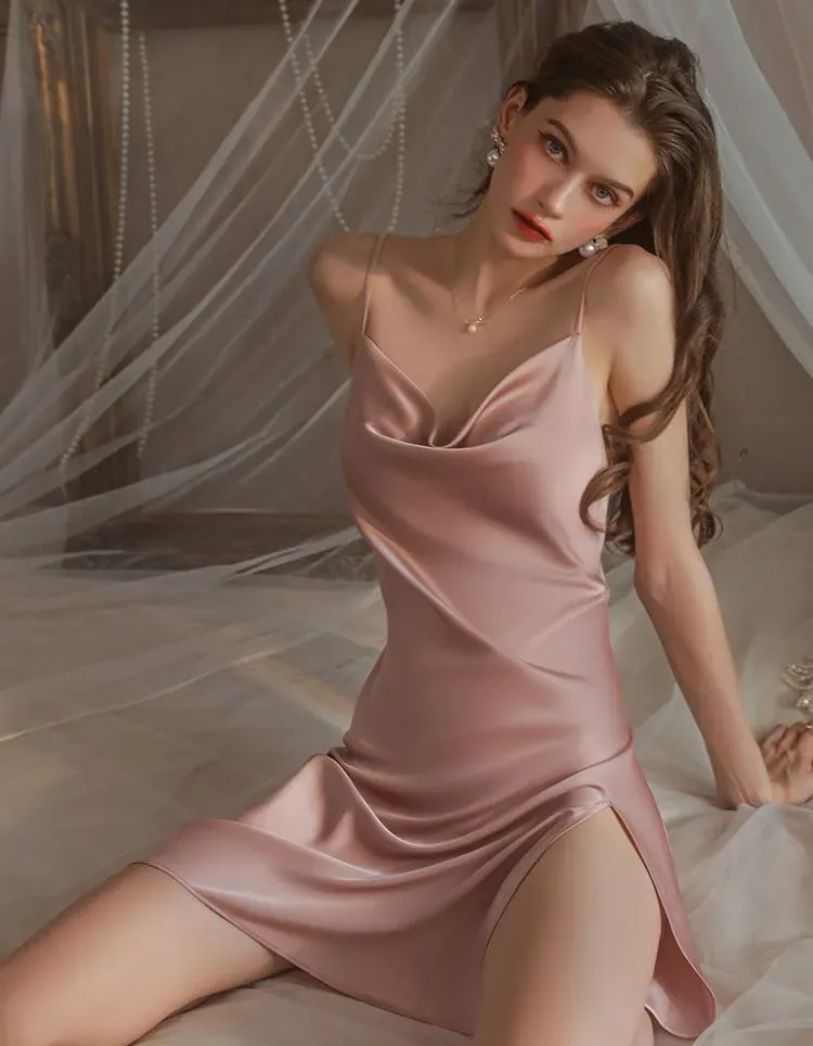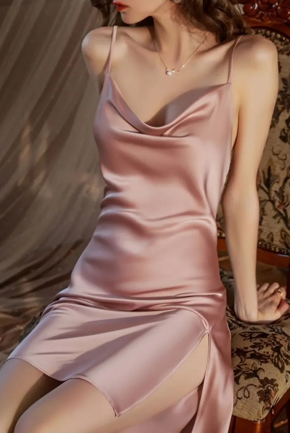 純慾風性感冰絲長款蕩領仿真絲純色吊帶睡裙