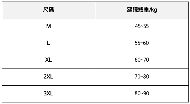 • 此處給出的參考尺寸表只是一個標準指南