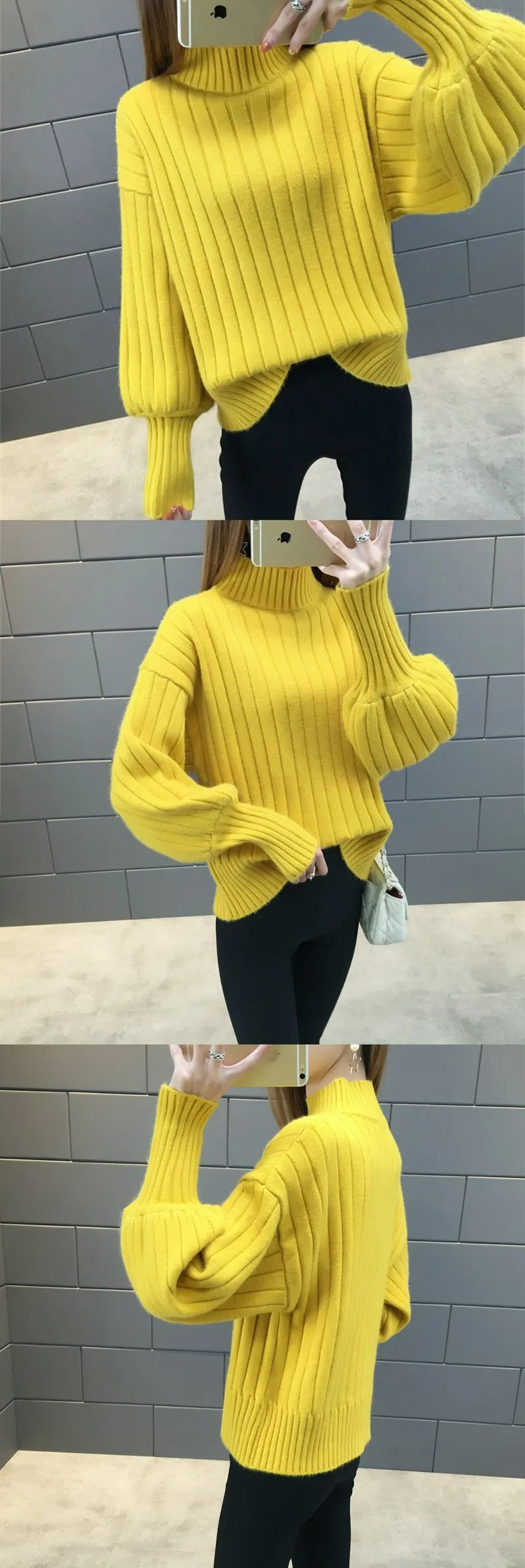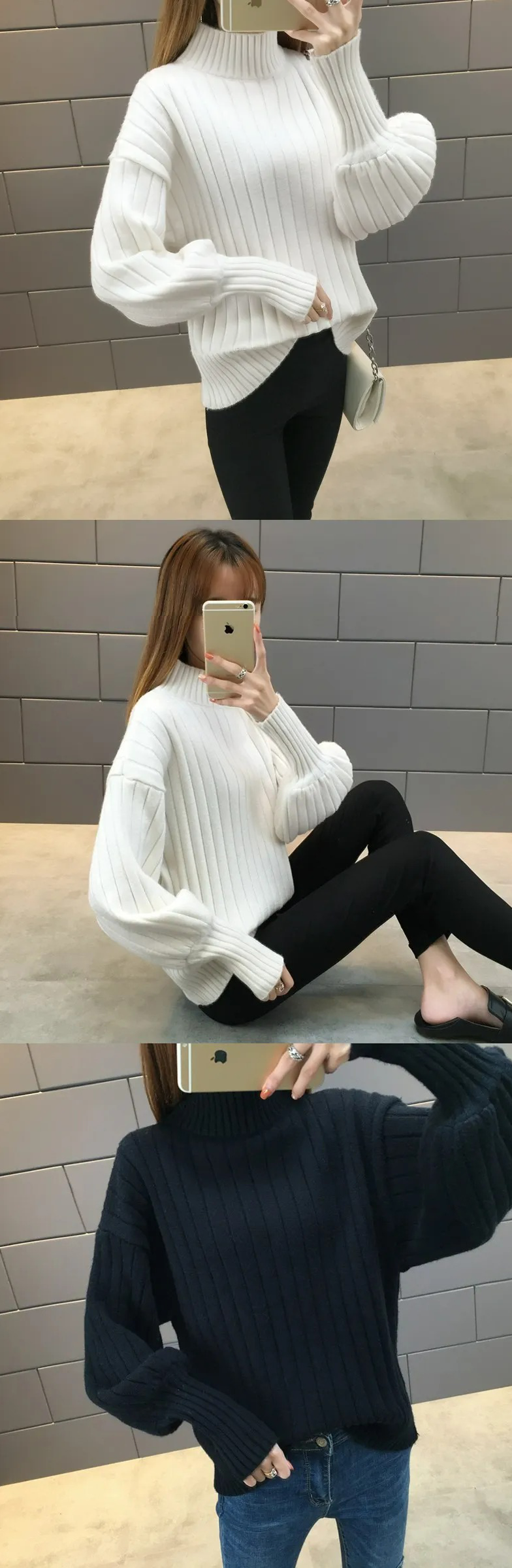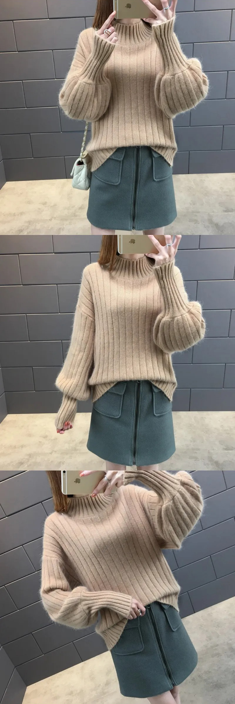 燈籠袖百搭慵懶風半高領寬鬆針織毛衣