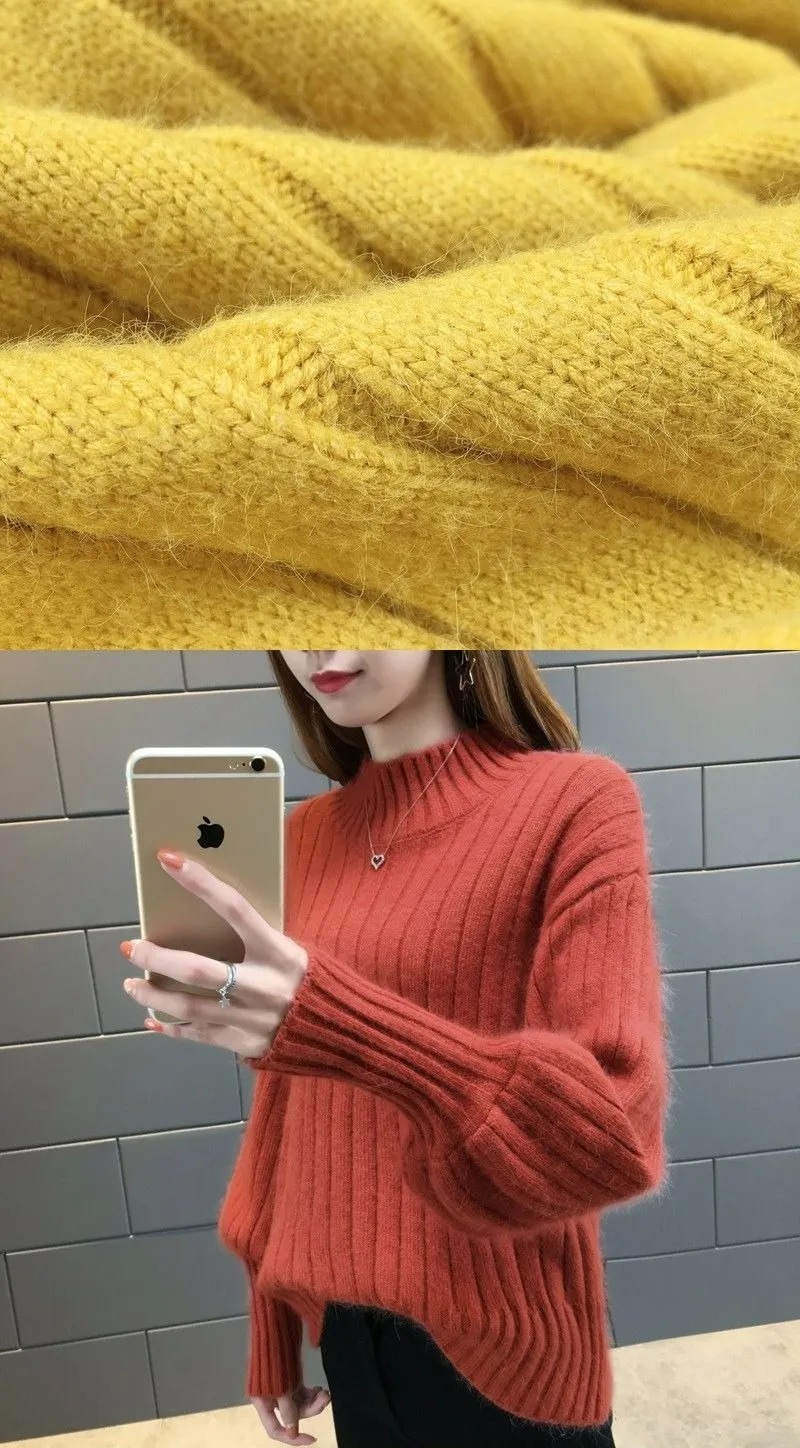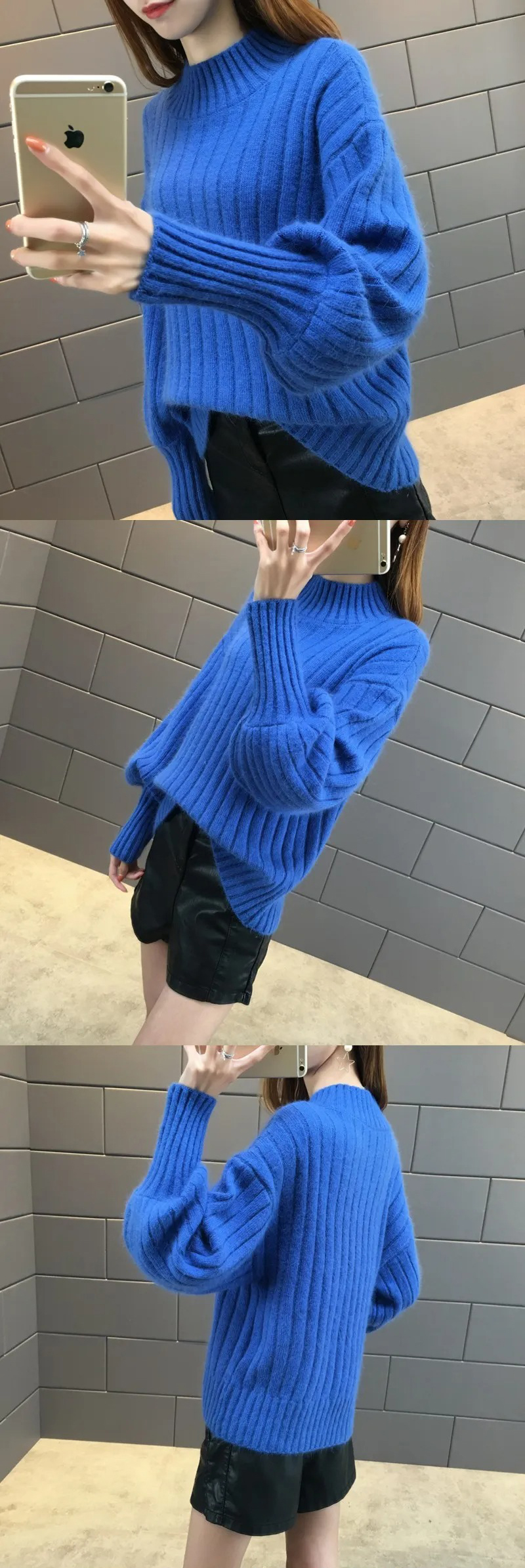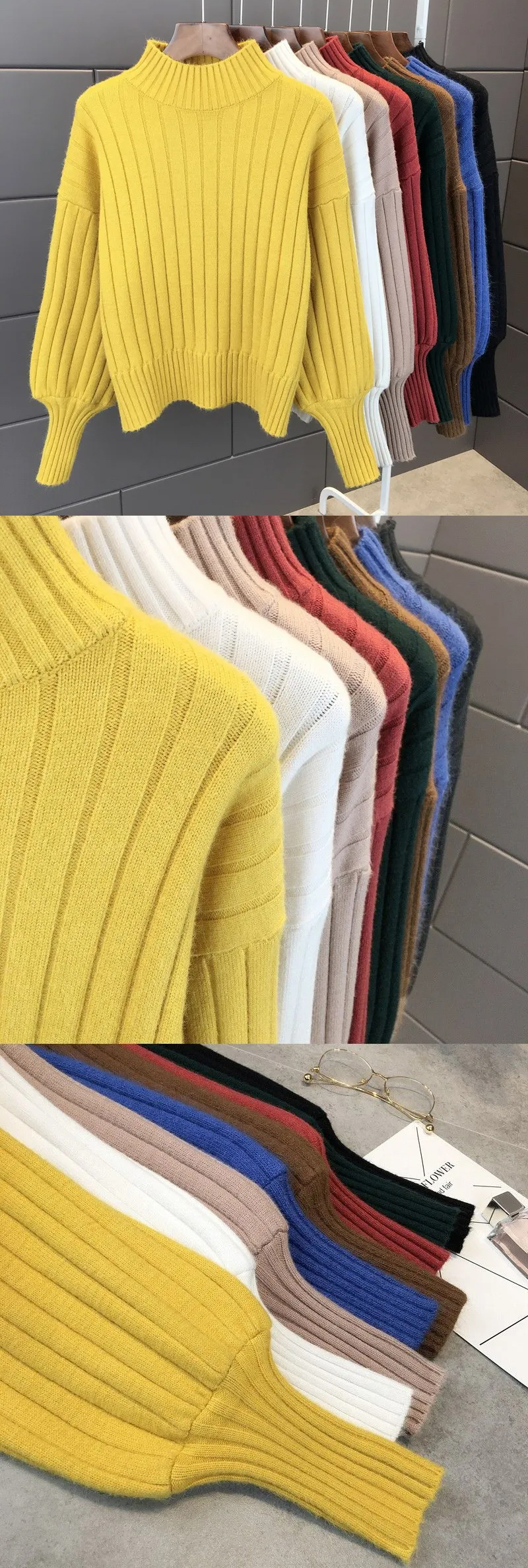 燈籠袖百搭慵懶風半高領寬鬆針織毛衣
