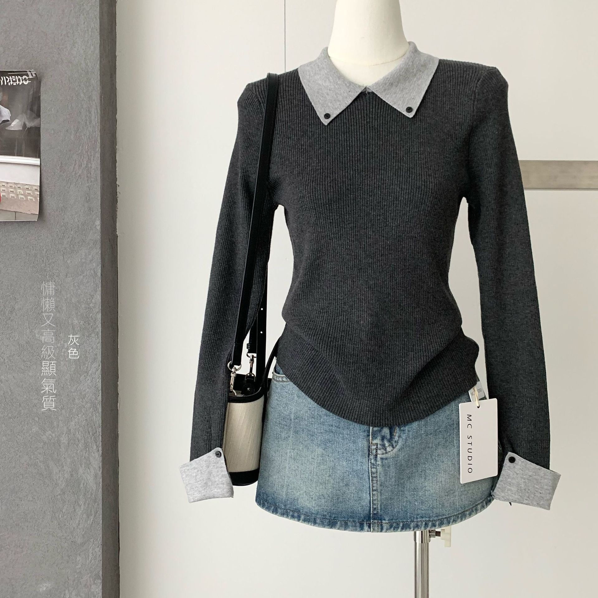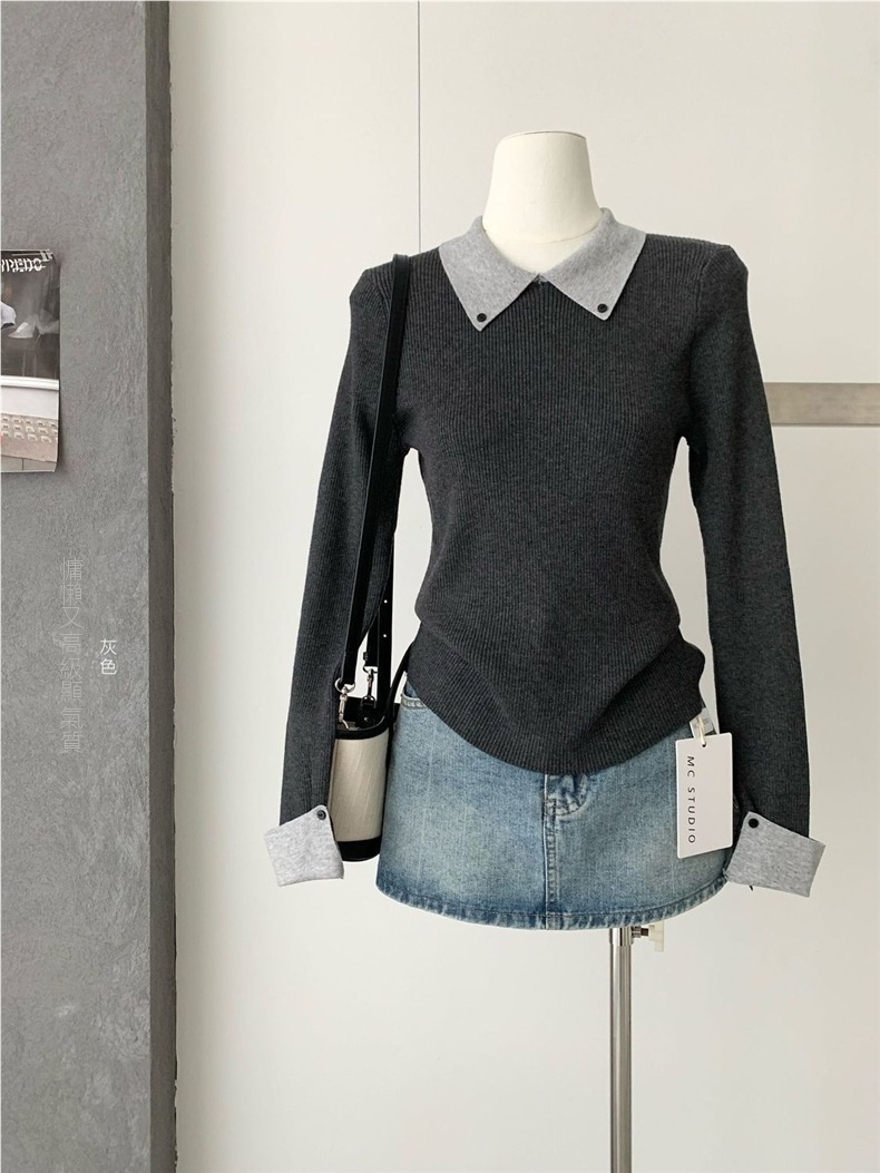 復古翻領拼接撞色內搭顯瘦修身針織毛衣