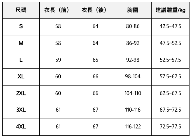 - 此處給出的參考尺寸表只是一個標準指南