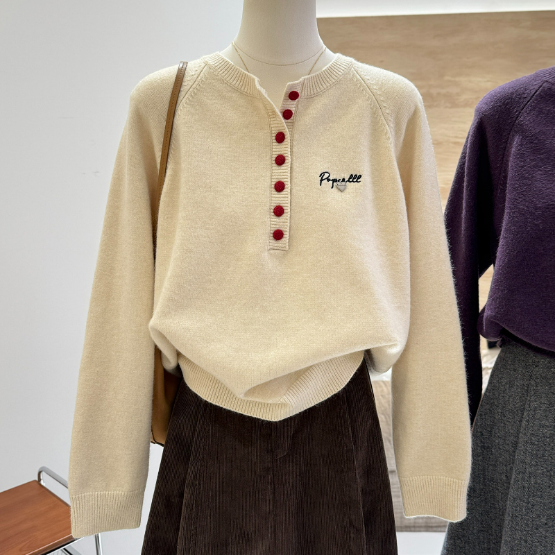 韓系半開領紐扣時尚顯瘦字母刺繡針織毛衣